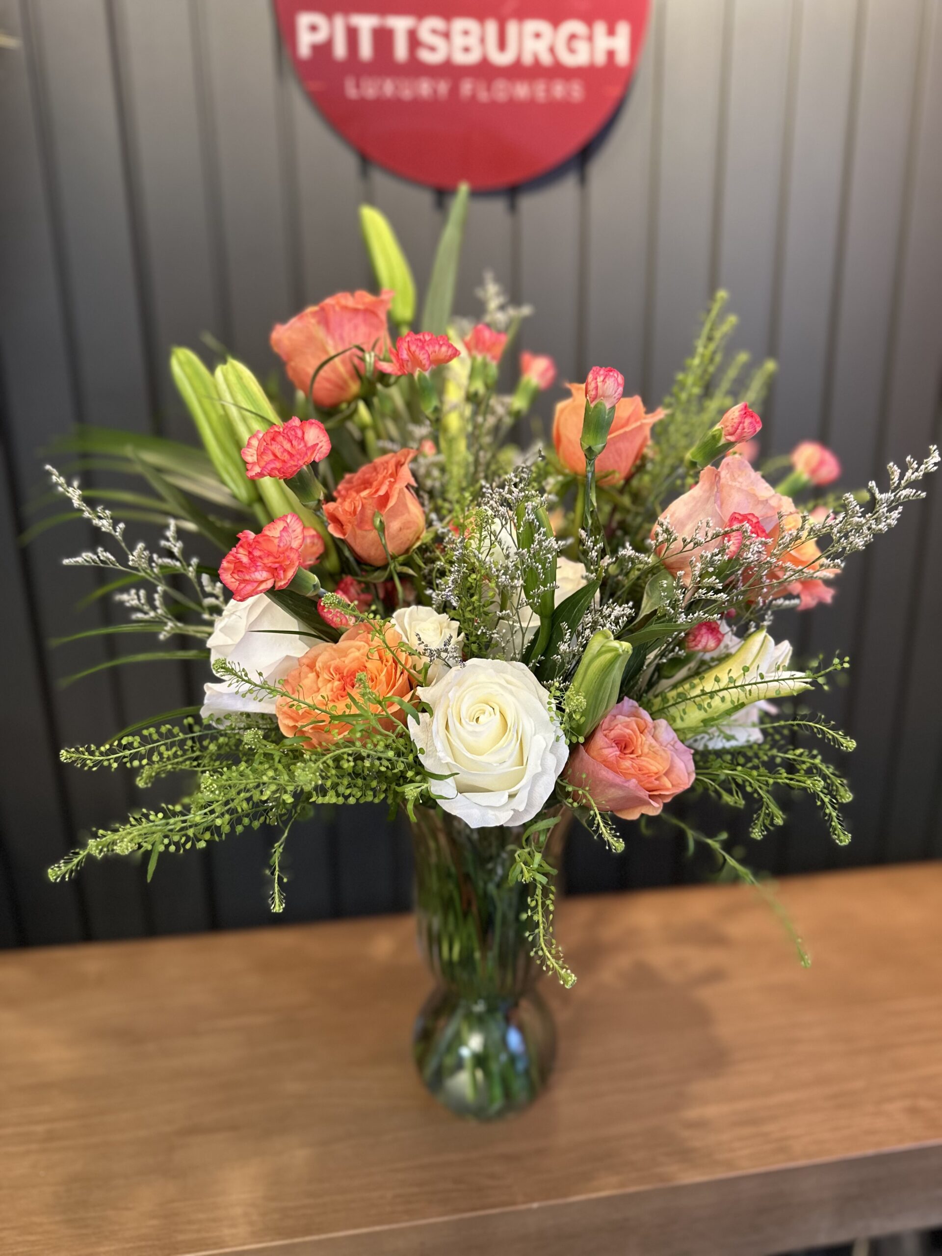A luxurious large size vase arrangement featuring coral roses, white blooms, and lush greenery a perfect blend of color and sophistication. Ideal for birthdays, celebrations, or elegant home décor.