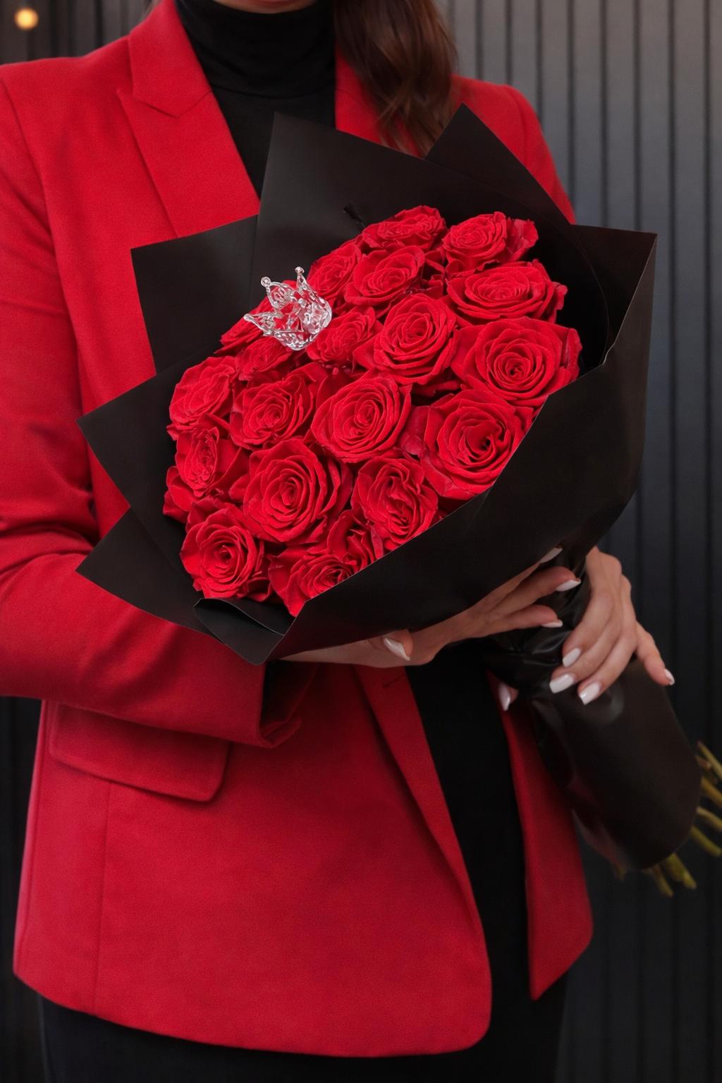 20 premium roses , with black wrap and accented with crown . Perfect for any occasions and Valentine’s Day