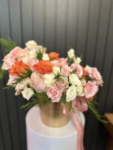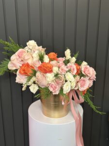 Oh White , pink , orange roses and spray roses combined with winter greenery in gold vase . Calm and elegant , arranged in golden vase . Perfect for any occasion