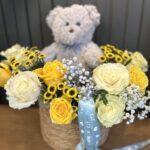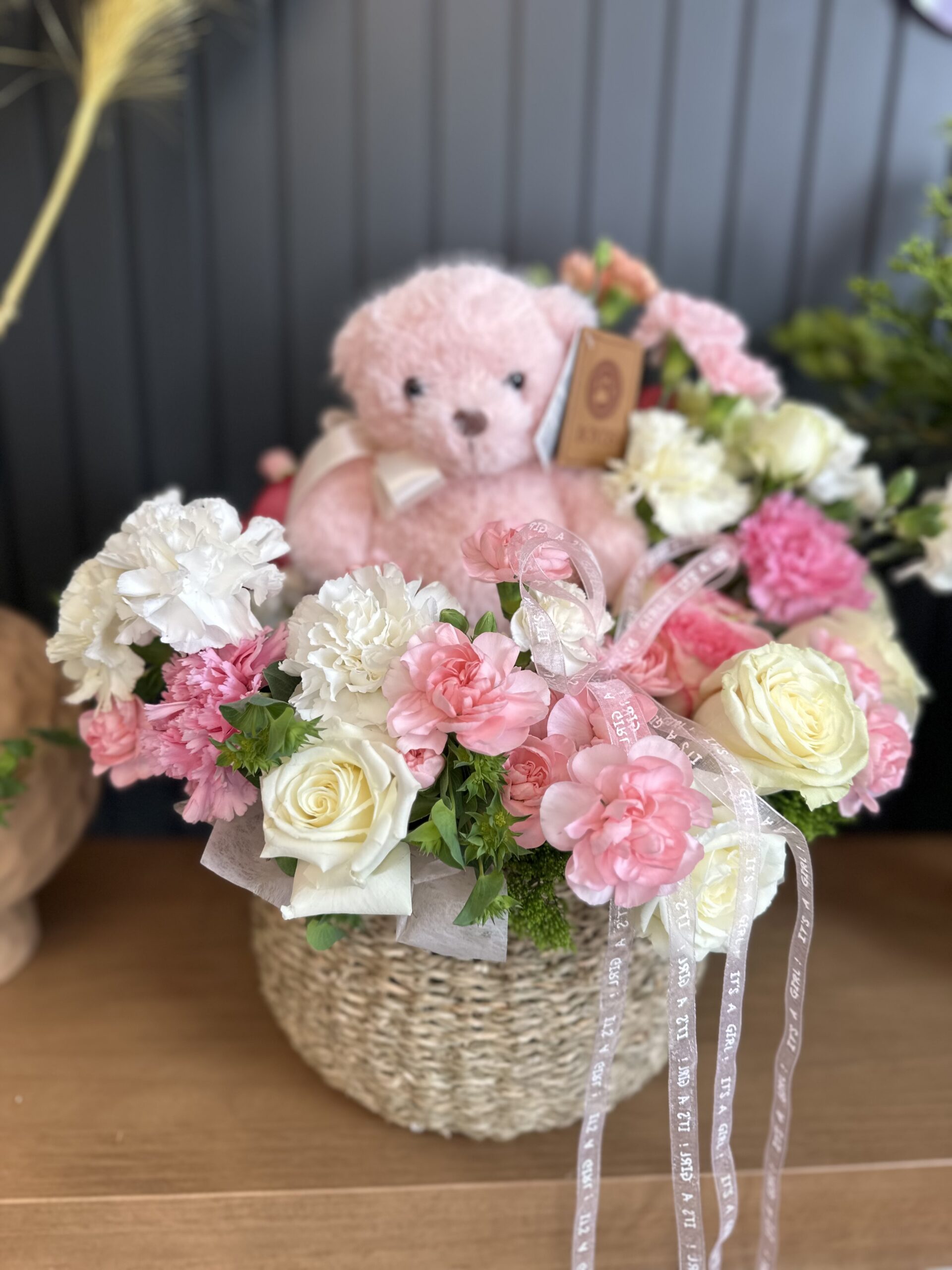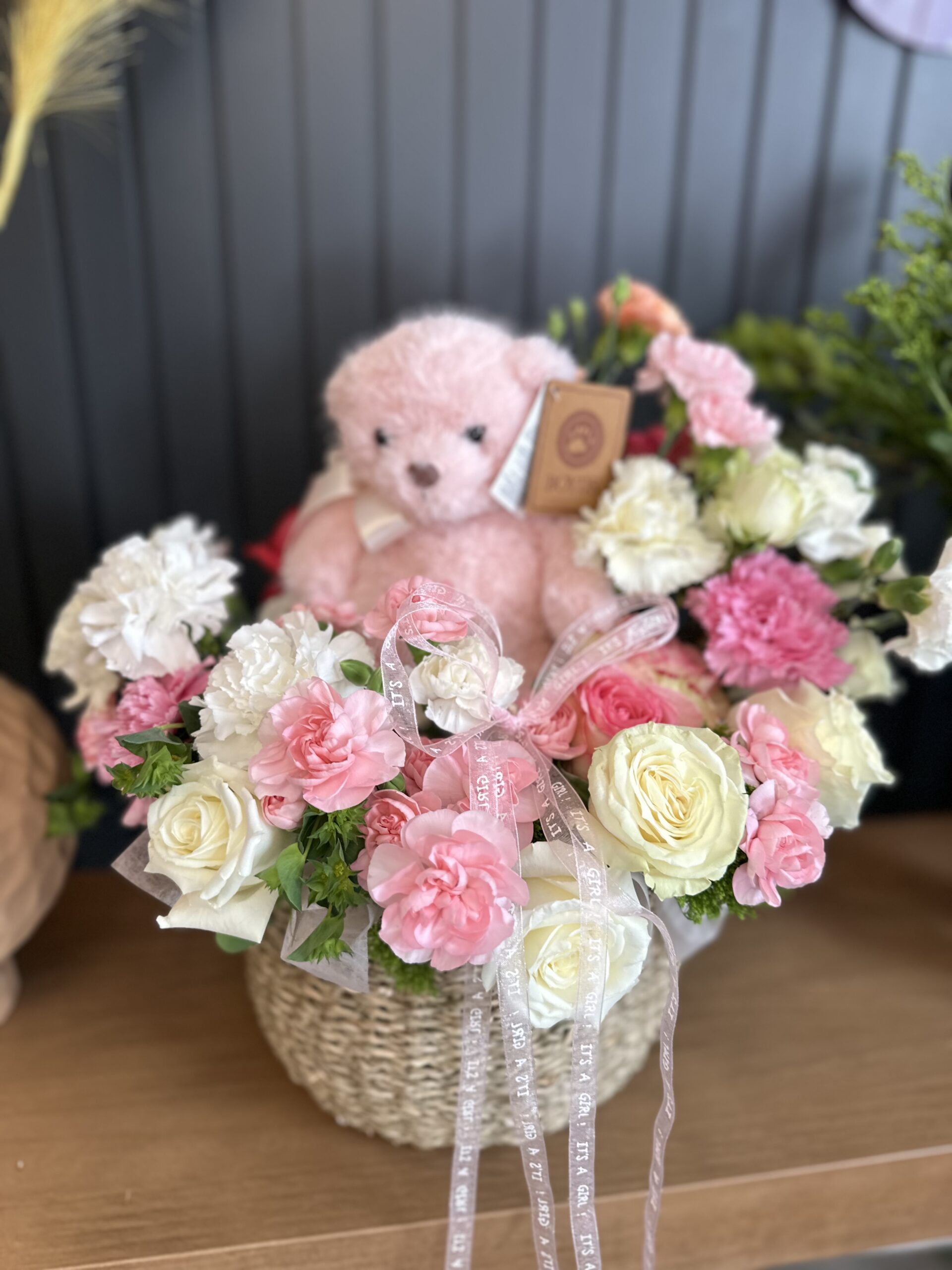 A sweet and elegant floral basket designed to celebrate the arrival of a baby girl. Featuring a soft teddy bear in pink or white, pastel blooms, and delicate matching ribbons the perfect way to welcome a new little princess.