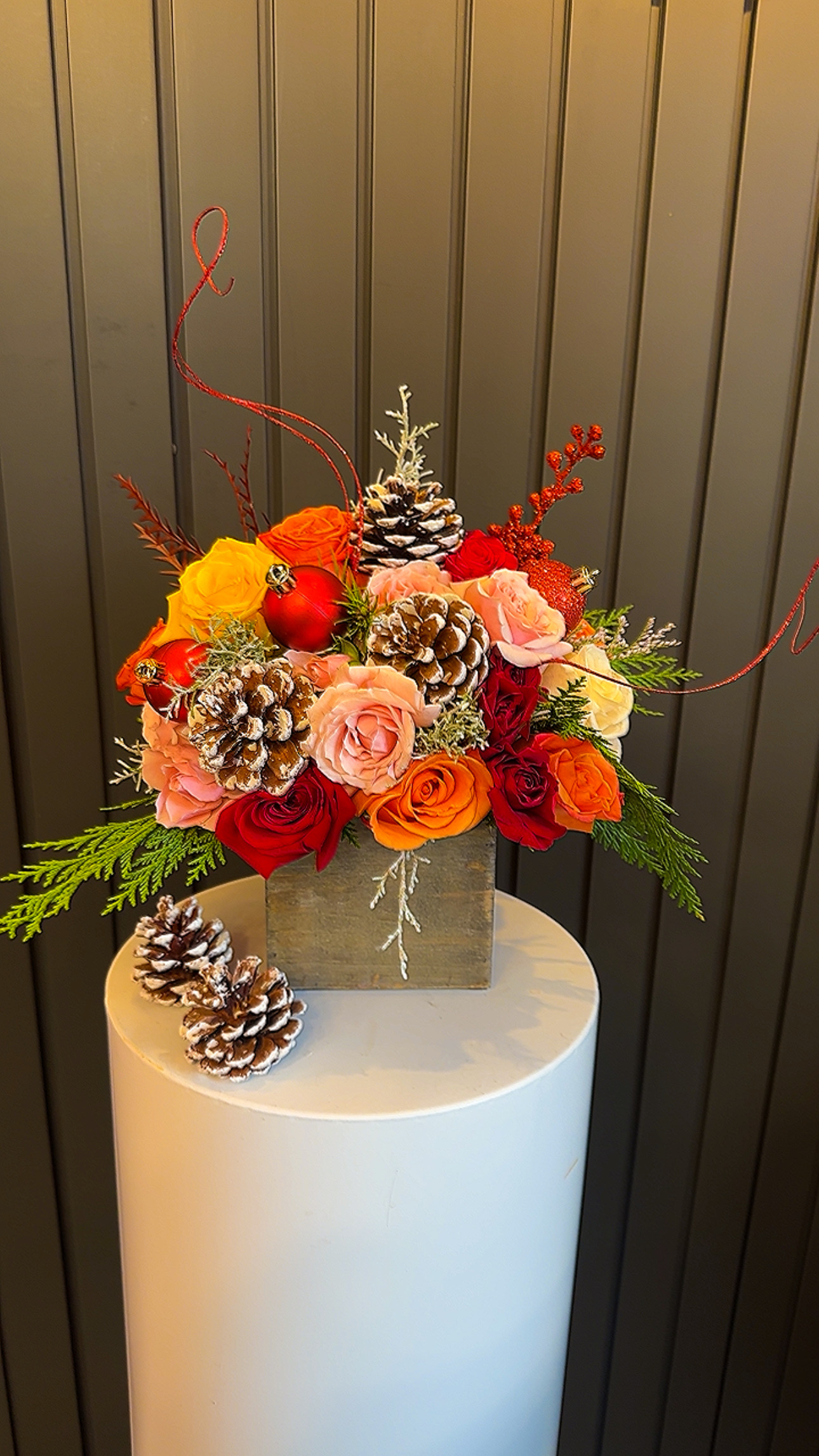 Winter / holiday nest . Fresh flowers with winter greens mixed with holiday ornaments